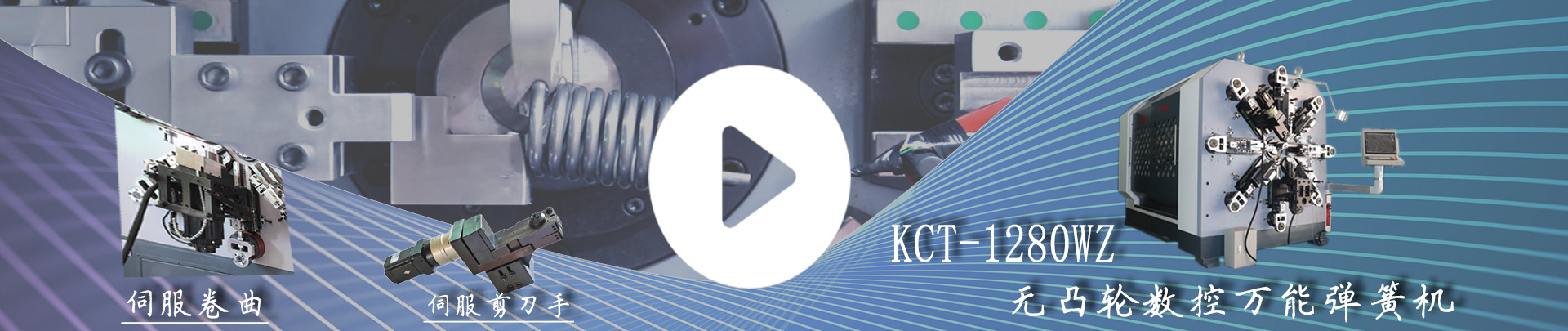 【彈簧機視頻】KCT-1260WZ十二軸數控萬能彈簧成形機,采用臺灣電腦數控系統和日本安川伺服電機,獨特的無凸輪和無搖臂設計,刀架由八組伺服馬達獨立控制,其中包括刀架八軸、送線軸、轉芯軸、轉線軸和卷曲軸。KCT-1260WZ彈簧機統成由曲柄連桿成形系統、送線和轉線系統、繞線校直系統及轉芯系統等組成。本機可配帶液壓剪刀裝置,成形切割噪音小,對芯棒及機器的損害為零。適合于生產各種拉簧、扭簧、壓簧、渦卷簧、塔形簧、扁線簧等高難度的異形彈簧。此機極大的增加了彈簧加式范圍,成形精密準確,調機方便快速,生產穩定。