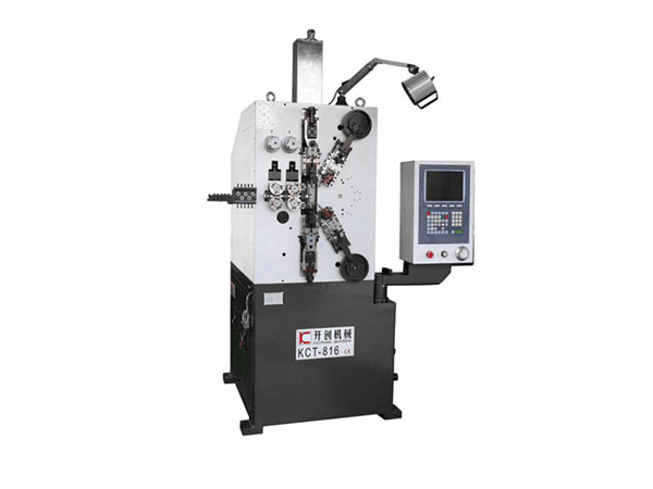 Our company's KCT-816 8 Axis CNC High-speed spring coiling machine mainly imported from Japan Yaskawa servo motor and Taiwan computer Windows7 control system, the shaft can operate independently or synchronous operation. The company's design team has made great reform in innovation and improvement, and has realized the man-machine dialogue truly, has one minute spring molding, the production speed is fast, the precision is high, the noise is low, the debugging is more convenient. KCT-816 computer compression spring machine can realize the function of cutting, cutting and swing cutting in different angles, and also has the function of high-definition camera inspection.