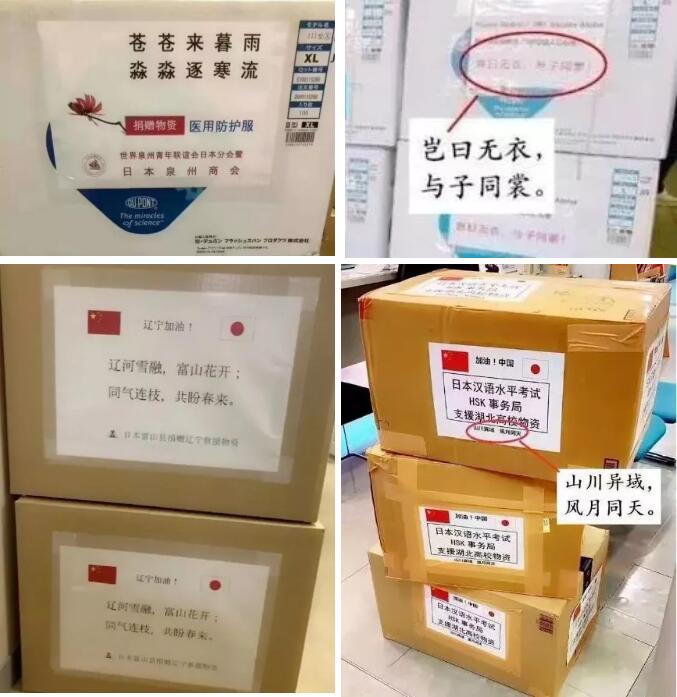 日本政府在疫情開始的第一時刻,就保證會幫助中國渡過難關(guān)。日本株式會社捐贈了3300套防護服、6000雙鞋套、賦詞豈日無衣,與子同裳。富山縣向友好省縣遼寧省捐贈了一萬枚口罩,上面寫著:遼河雪融,富士花;同氣連枝,共盼春來。HSK事務(wù)所捐贈了兩萬枚口罩,上面寫著:山川異域,風月同天。