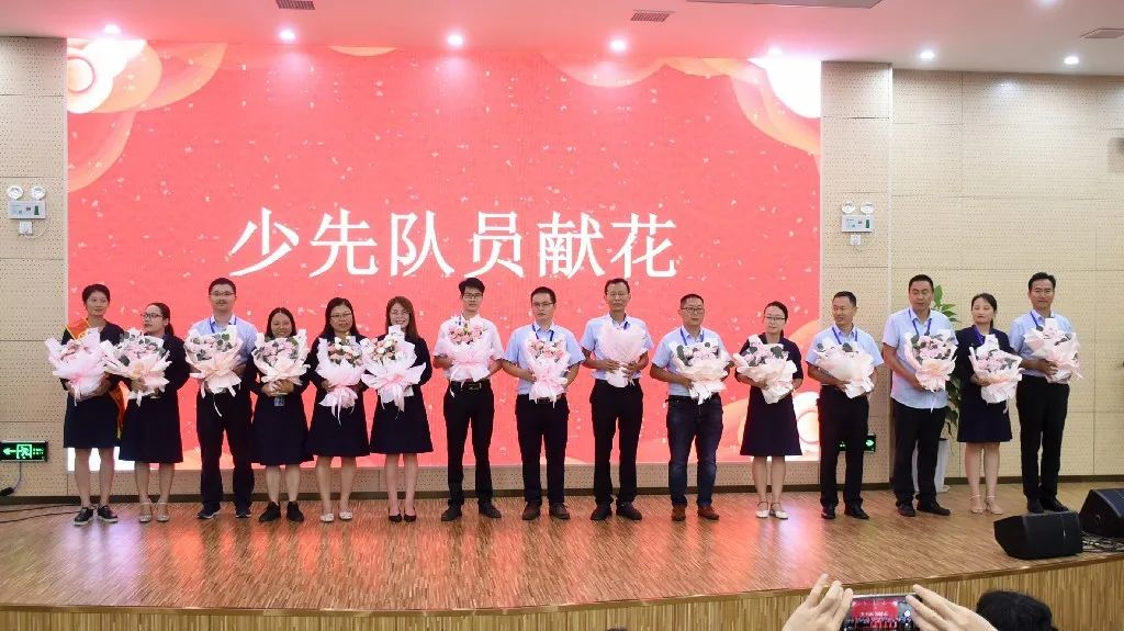 少先隊(duì)員們給教師家長(zhǎng)代表獻(xiàn)花
