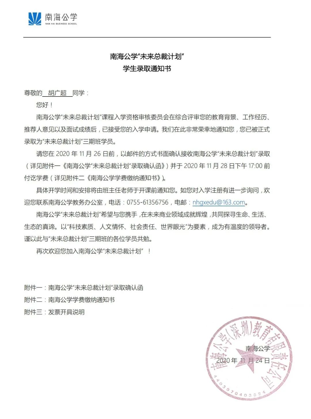 被南海公學正式錄取為