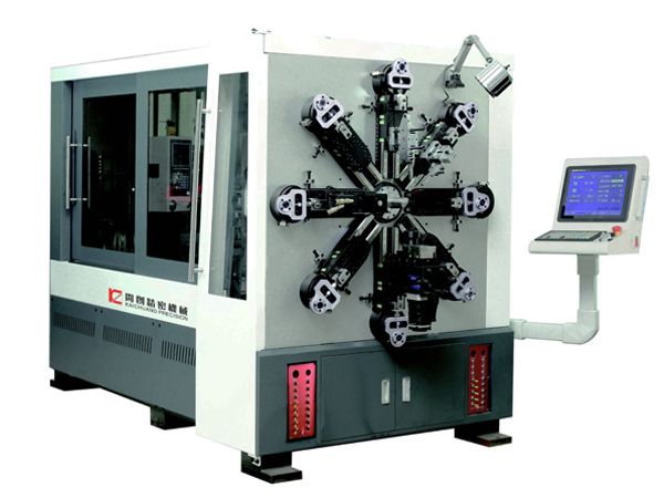 開創KCT-1245WZ十二軸無凸輪數控萬能彈簧轉線成形機利用臺灣Windows7操作控制系統、引用日本進口安川伺服電機,采用獨特的無凸輪和無搖臂設計,刀架由八組伺服馬達獨立控制,其中刀架八軸、送線一軸、轉芯一軸、轉線一軸和卷曲一軸,其統成由曲柄連桿成形系統、送線系統、轉線系統、校直系統和轉芯系統等組成。此外,該機型可配帶液壓剪刀裝置,切割噪音小,對芯棒及機器的損害為零;同時也可訂配多功能機械手,不僅具有成形快、精度準和性能穩等特點,而且調機更方便,易操作。